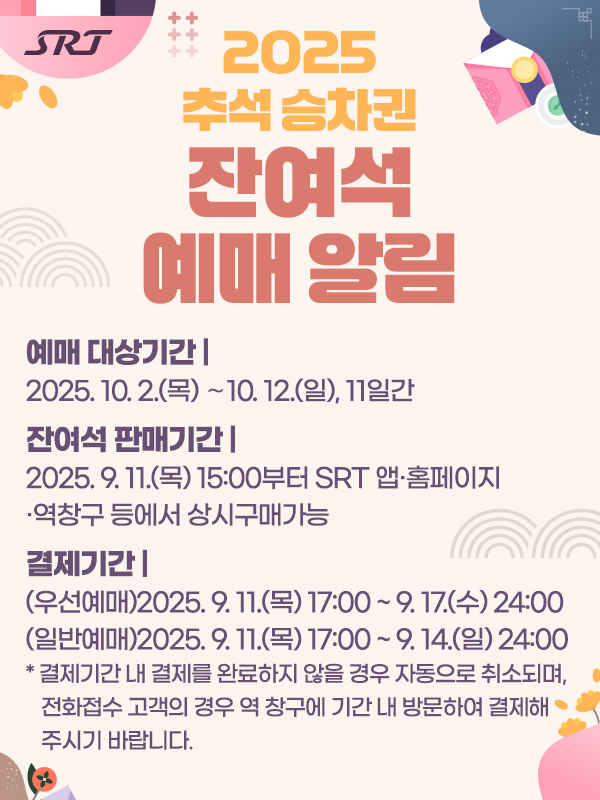 까지 승차권 예약·발매일 조정에 따라 SRT앱 접속인원이 증가하여 접속 대기시간이 길어질수 있습니다.